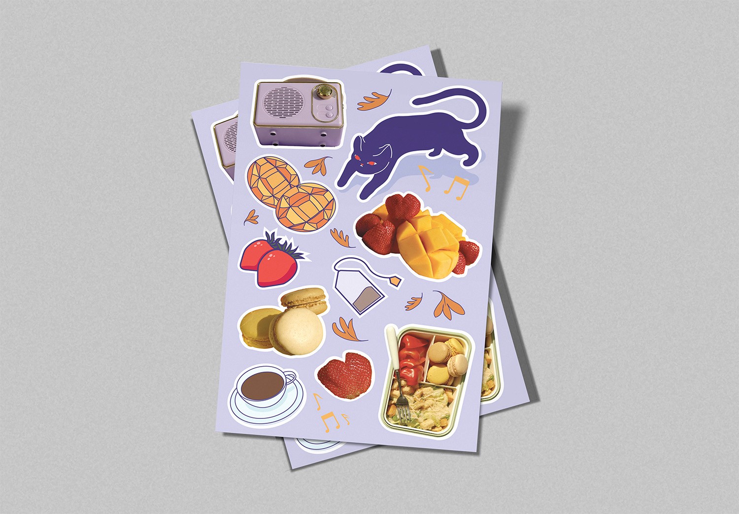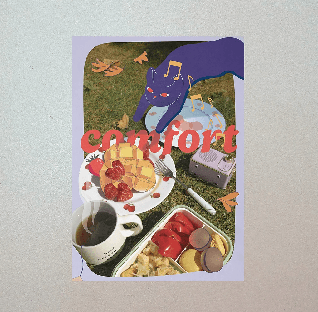 This poster was designed as an homage to all the little things that give me comfort, including hot tea, fresh fruit and vegetables, sweets, music, and cats. The design merges our world with the cat's world.